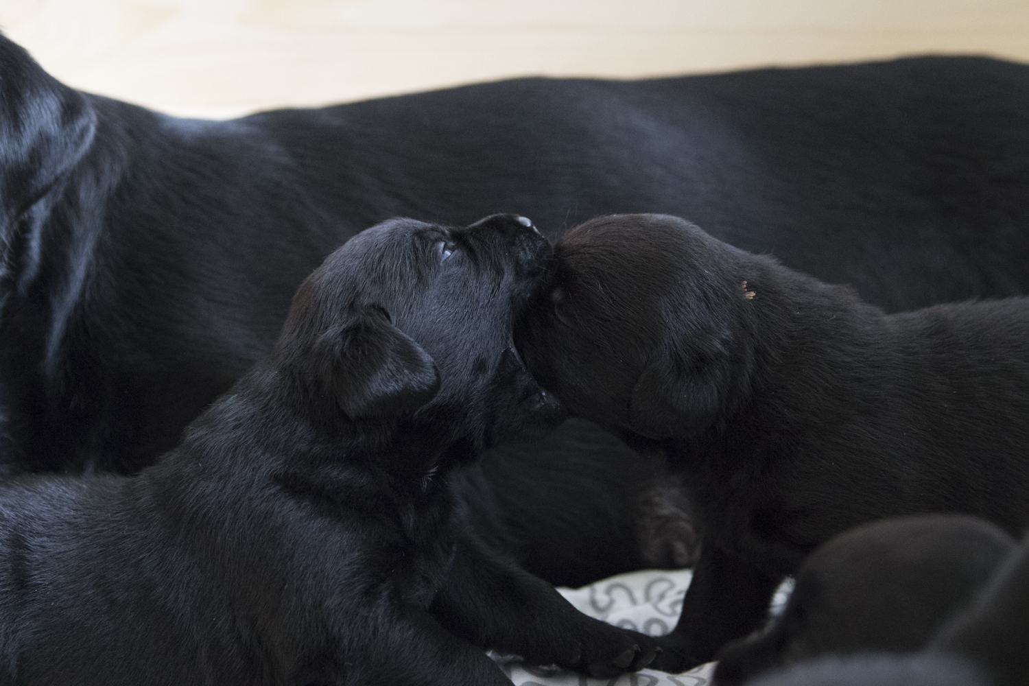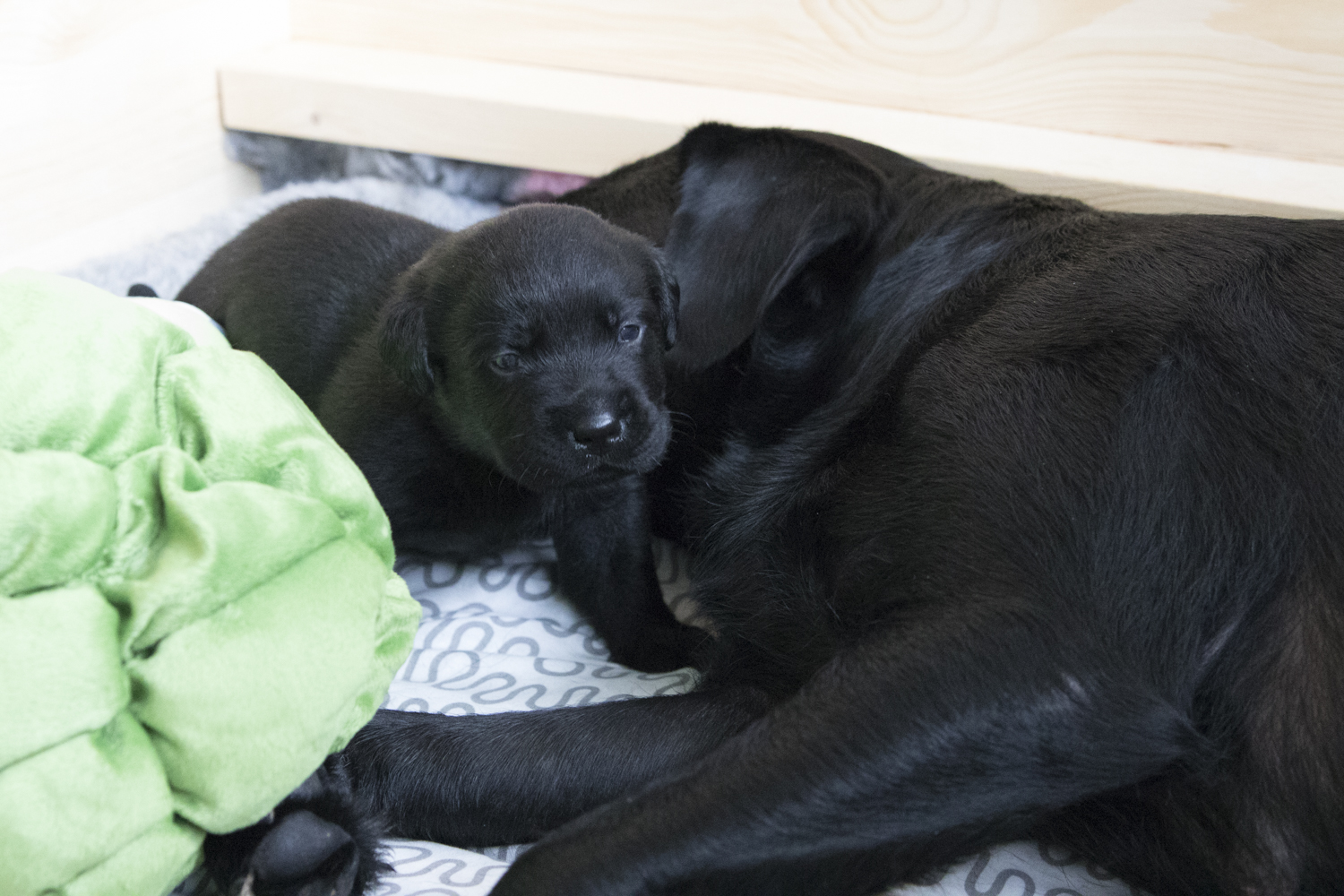 Sogar die Wurfkiste mussten wir verkleinern...es war Samstag Abend als Fiby plötzlich total gestresst durch die Wurfkiste rannte und die Welpen von einem Eck ins nächste trug. Bis ich endlich kapierte, dass Frau Übermutti ihre Welpen unbedingt in ihrer Nähe haben will...alle an einem Fleck. Jetzt ist die Wurfkiste um mehr als die Hälfte kleiner...und Fiby um einiges zufriedener. Ich bin so stolz auf sie und freue mich, dass meine Babies so viel Fürsorge und Liebe erfahren dürfen...nicht nur von mir, sondern auch von ihrer Mami.