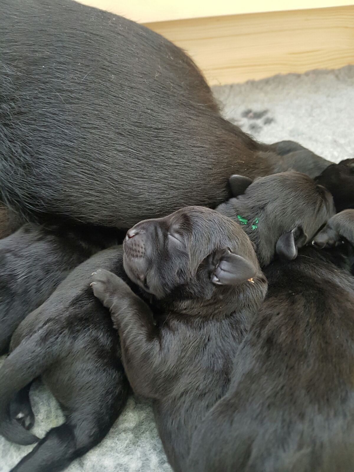 Mein Tag besteht hauptsächlich aus putzen, Wäsche waschen, wieder putzen, wieder Wäsche waschen...und natürlich Fiby mit ihren Babies beobachten. Anfangs lief ich noch bei jedem Welpen-Schrei zur Wurfkiste um zu kucken ob alles in Ordnung ist...mittlerweile weiß ich, dass alles bestens ist. Fiby ist eine noch tollere Hundemami als ich erwartet hatte. In der Nacht nach dem Kaiserschnitt und auch in den ersten Stunden am nächsten Tag, sah das noch ganz anders aus. Durch die Narkose war sie ziemlich mitgenommen und auch am nächsten Tag noch recht wackelig auf den Beinen. Vor den Welpen hatte sie Angst und ich konnte sie nur mit viel gutem Zureden überreden die Wurfkiste zu betreten. Und sobald sie wieder draußen war, flüchtete sie in einen anderen Raum und das Überredungsspiel ging von vorne los.