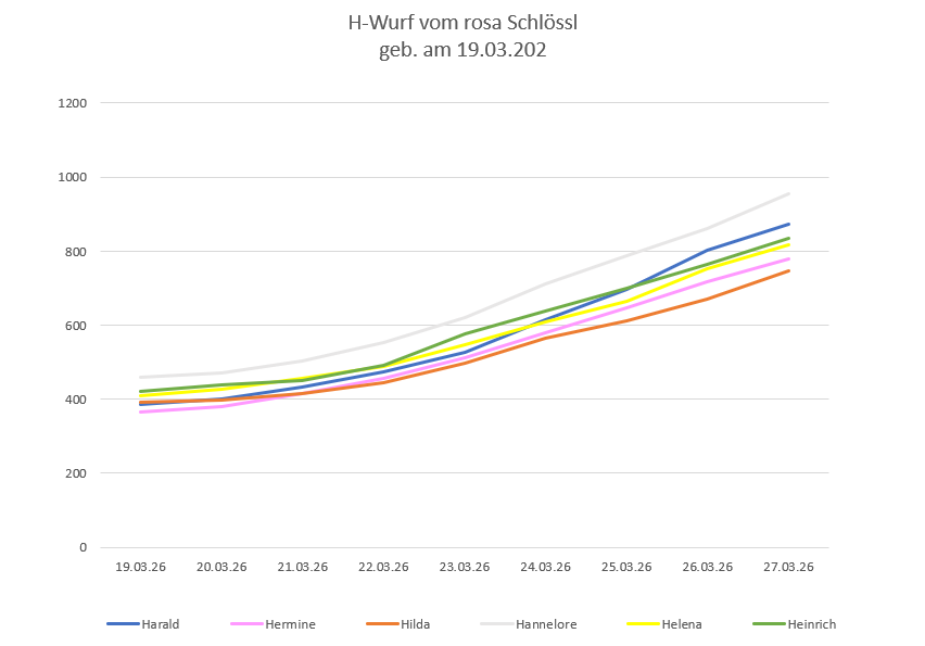 Dank der vielen Milch, nehmen die Welpen kräftig zu – teilweise 90 Gramm pro Tag. Somit haben sie ihr Geburtsgewicht an Tag 8 bereits verdoppelt. Spitzenreiterin ist unsere Hannelore. Hier die Gewichtskurve unserer Welpen: