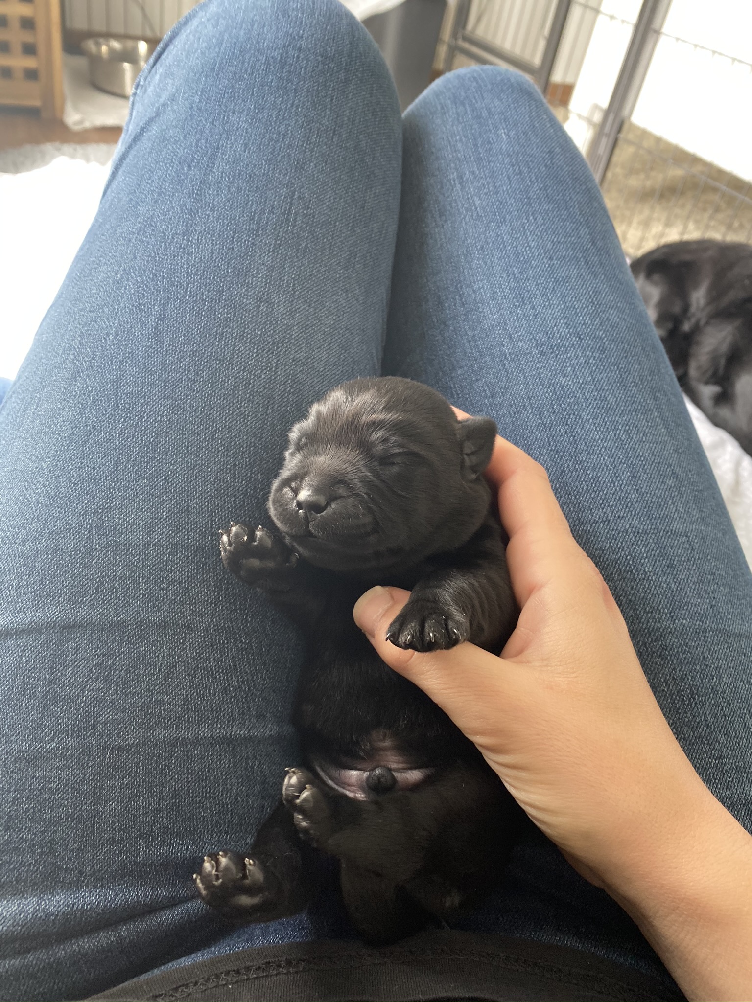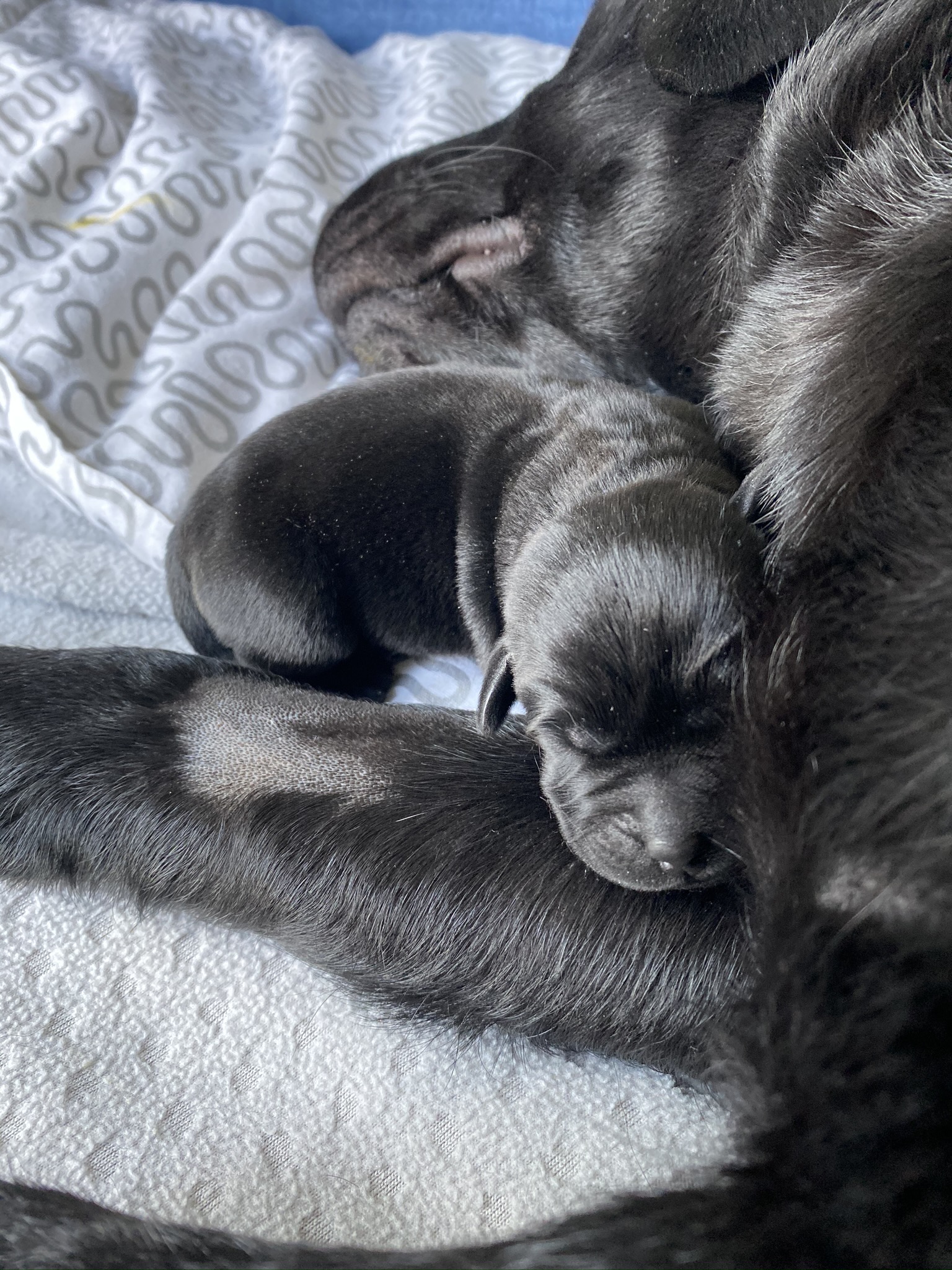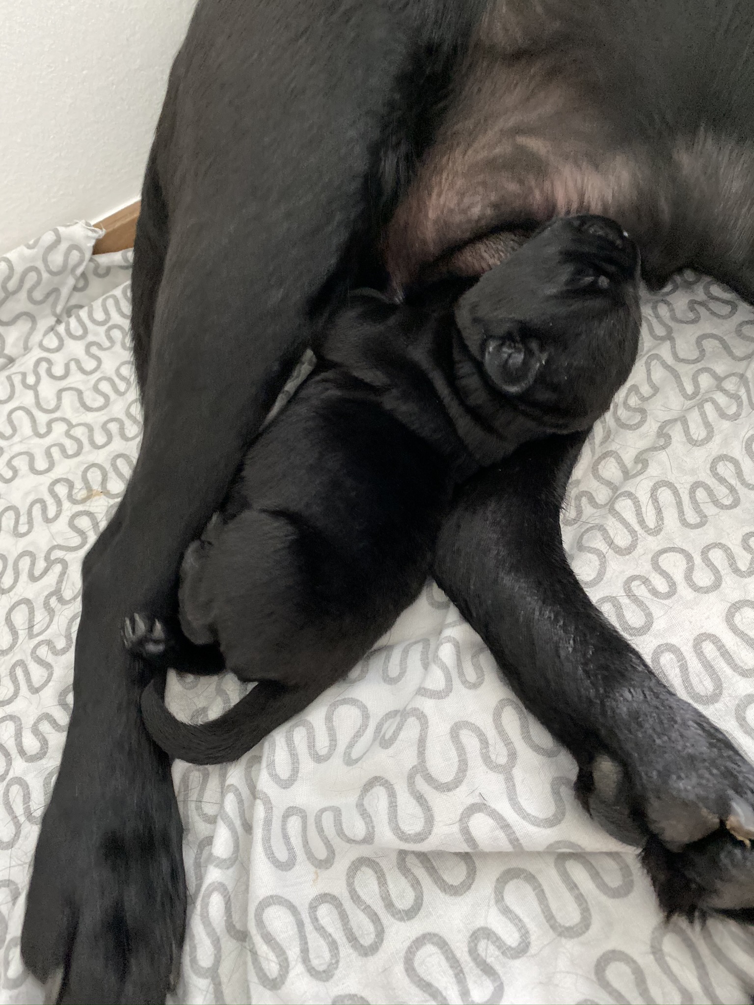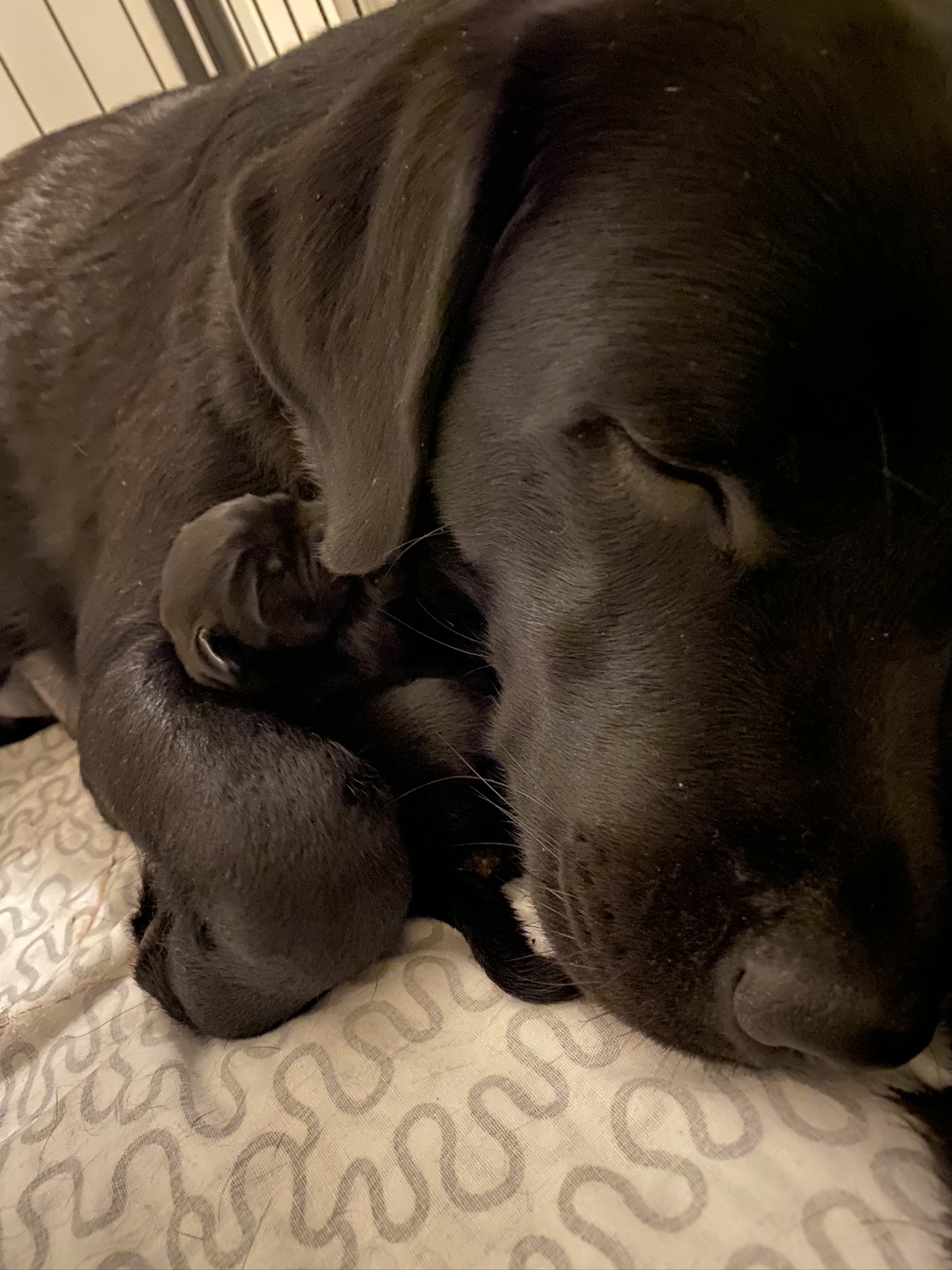 Da unser Erdgeschoss eher offen gestaltet ist und wir somit auch keine Türe zum Welpenzimmer haben, haben wir Annie und ihr Baby am 2. Tag kurzerhand in unser Schlafzimmer im 1. Stock übersiedelt. Hier herrscht deutlich mehr Ruhe (außer wenn Herrli nachts schnarcht…haha) und vor allem bei Annie merke ich, dass sie die Ruhe sehr genießt. Im Erdgeschoss war sie immer mit einem Ohr beim Rest des Rudels und konnte nicht so richtig entspannen. In der 3. Lebenswoche werden wir die beiden wieder ins Erdgeschoss übersiedeln und Oma Fiby und Tante Heidi in die Welpenerziehung mit einbinden.