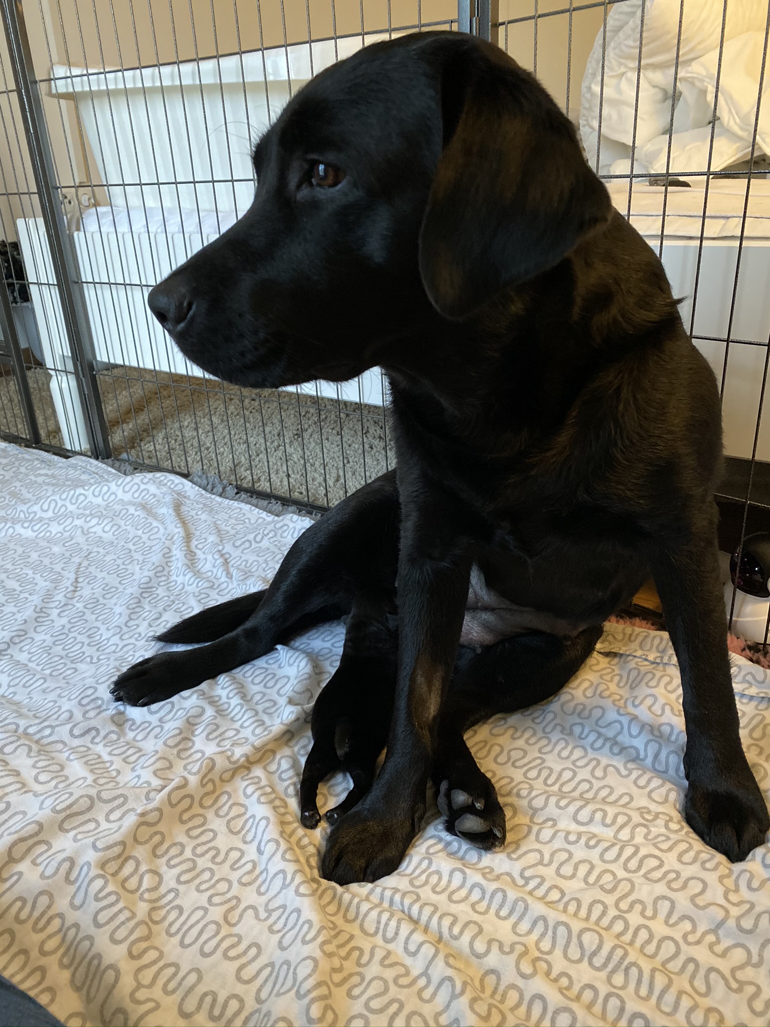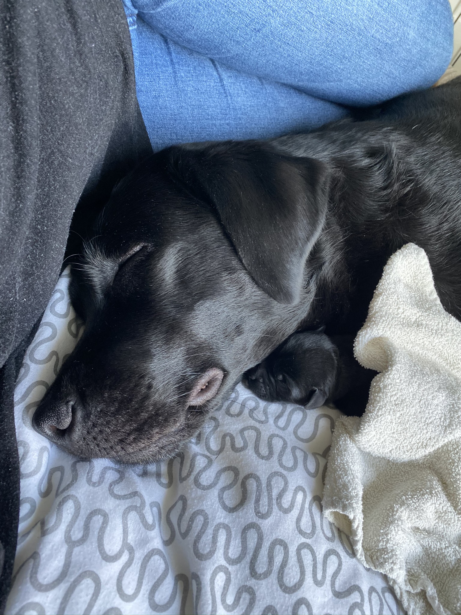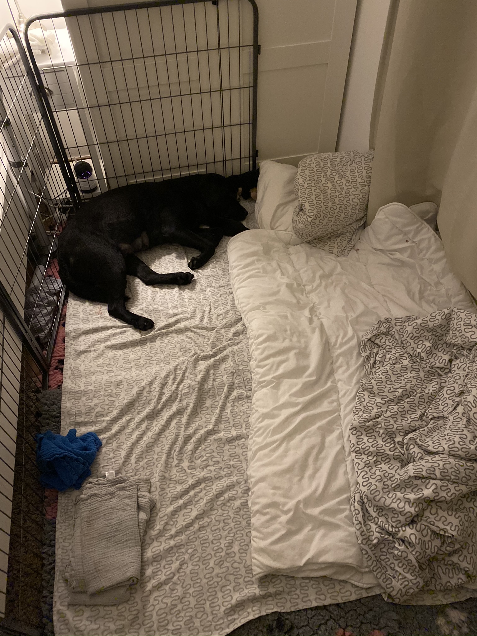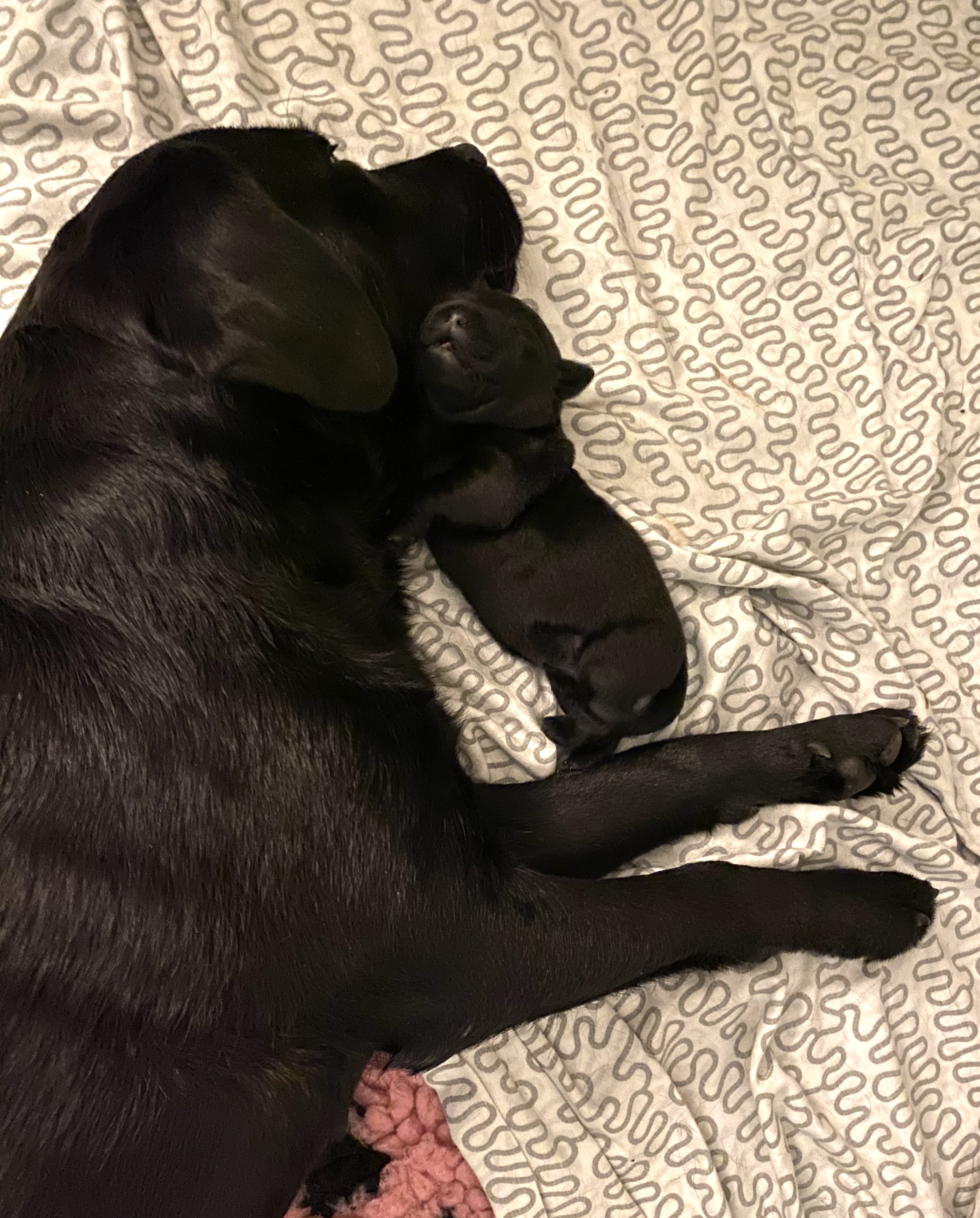 Da unser Erdgeschoss eher offen gestaltet ist und wir somit auch keine Türe zum Welpenzimmer haben, haben wir Annie und ihr Baby am 2. Tag kurzerhand in unser Schlafzimmer im 1. Stock übersiedelt. Hier herrscht deutlich mehr Ruhe (außer wenn Herrli nachts schnarcht…haha) und vor allem bei Annie merke ich, dass sie die Ruhe sehr genießt. Im Erdgeschoss war sie immer mit einem Ohr beim Rest des Rudels und konnte nicht so richtig entspannen. In der 3. Lebenswoche werden wir die beiden wieder ins Erdgeschoss übersiedeln und Oma Fiby und Tante Heidi in die Welpenerziehung mit einbinden.