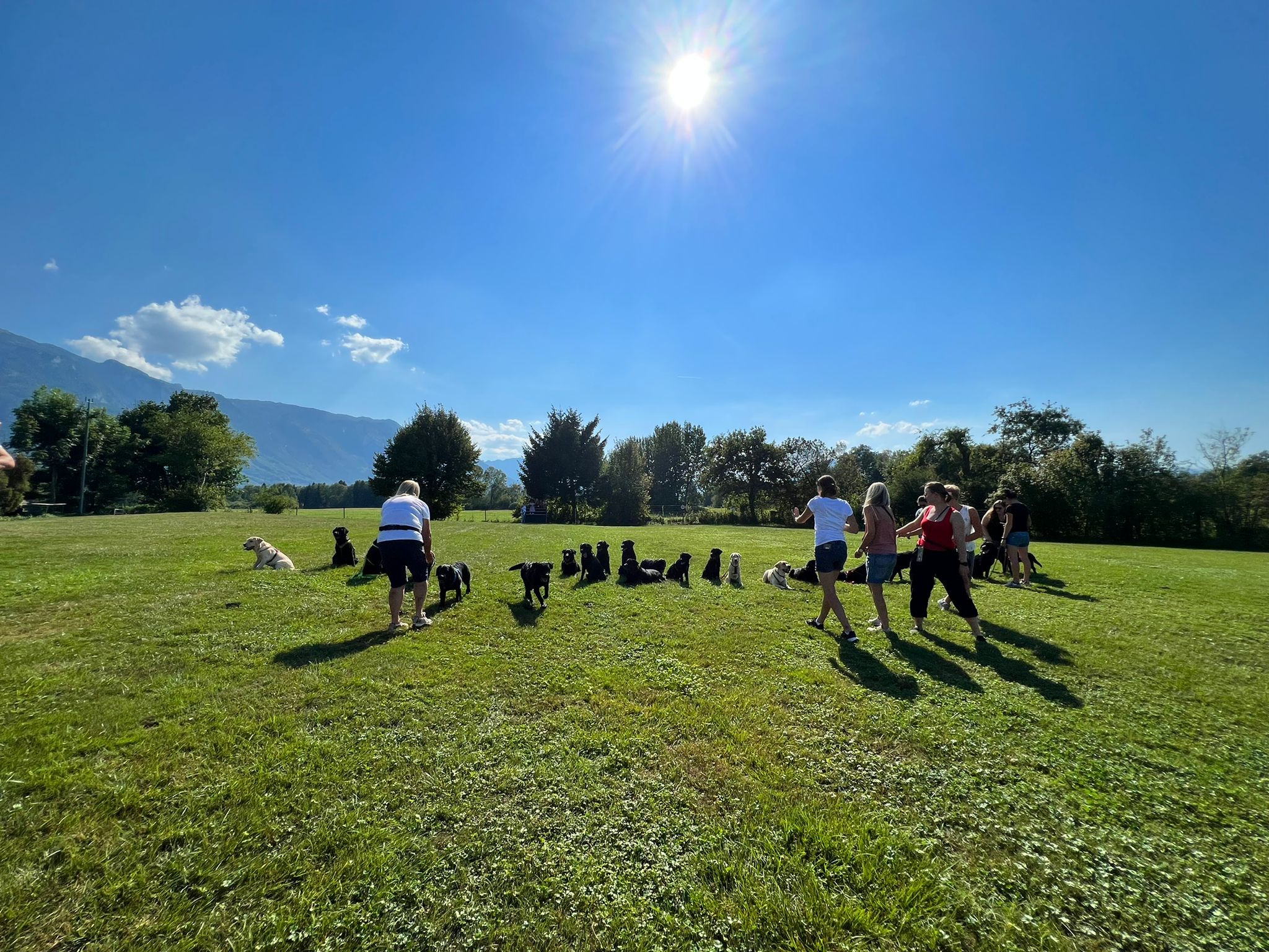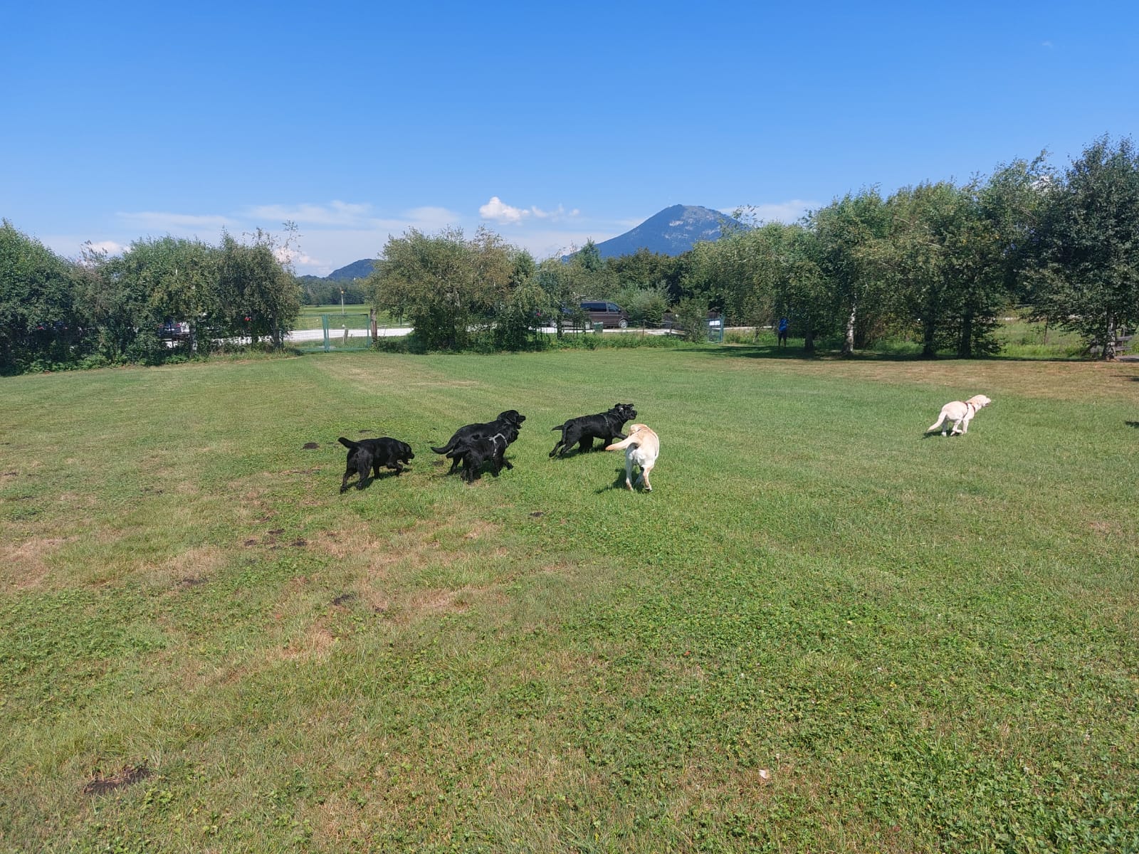 Da das nun mittlerweile 33 Hunde sind, mussten wir eine Alternative zu unserem üblichen Wanderausflug finden: erfreulicherweise stellte uns der ÖGV Salzburg sein wunderschönes Trainingsgelände für unser Treffen zur Verfügung. 1000 Mal “DANKE” an dieser Stelle nochmal – euer Trainingsgelände war die perfekte Location für das große rosa-Schlössl-Treffen.