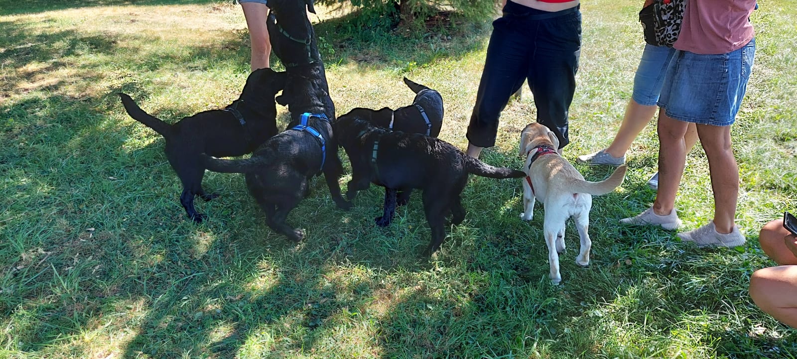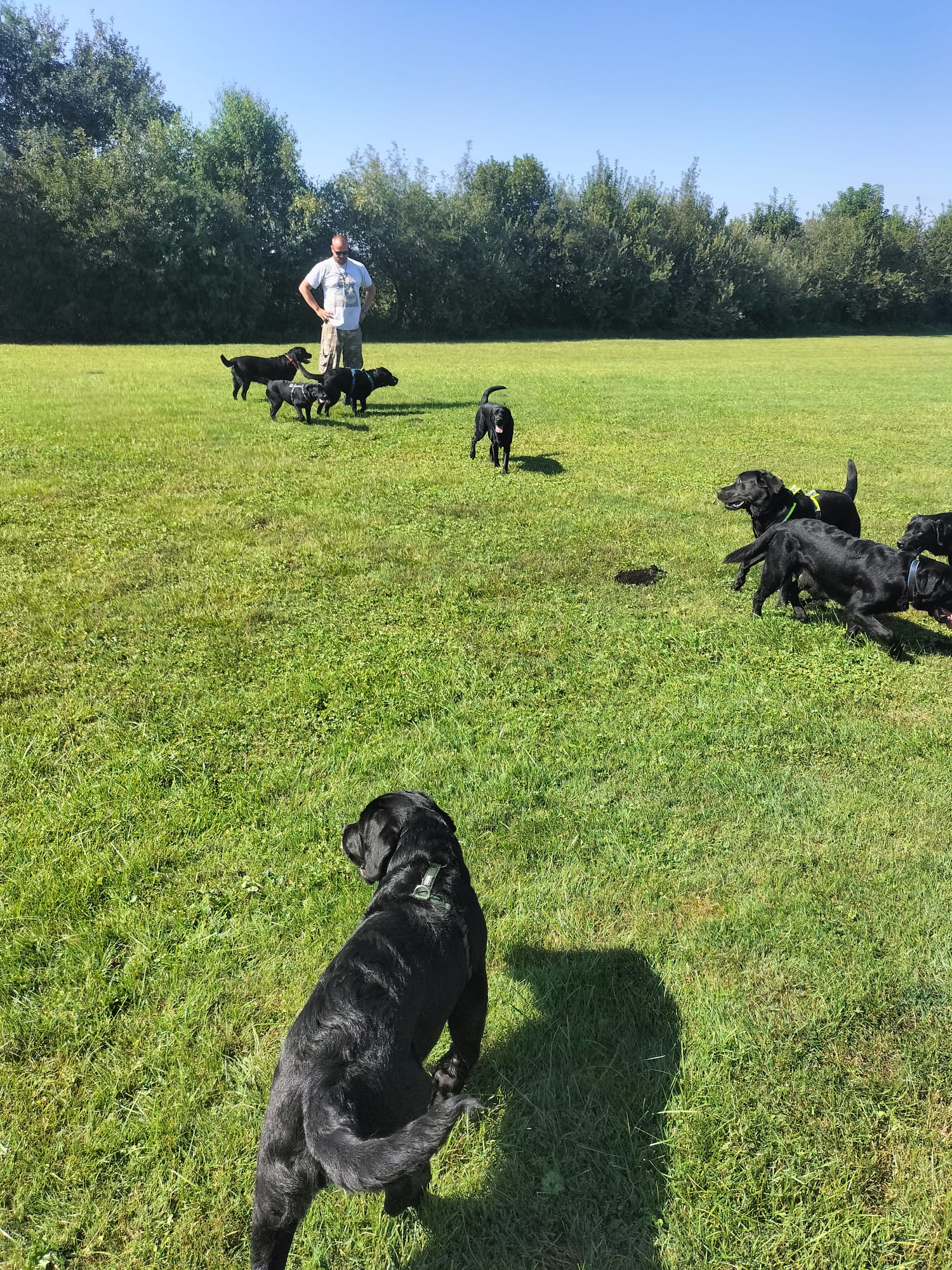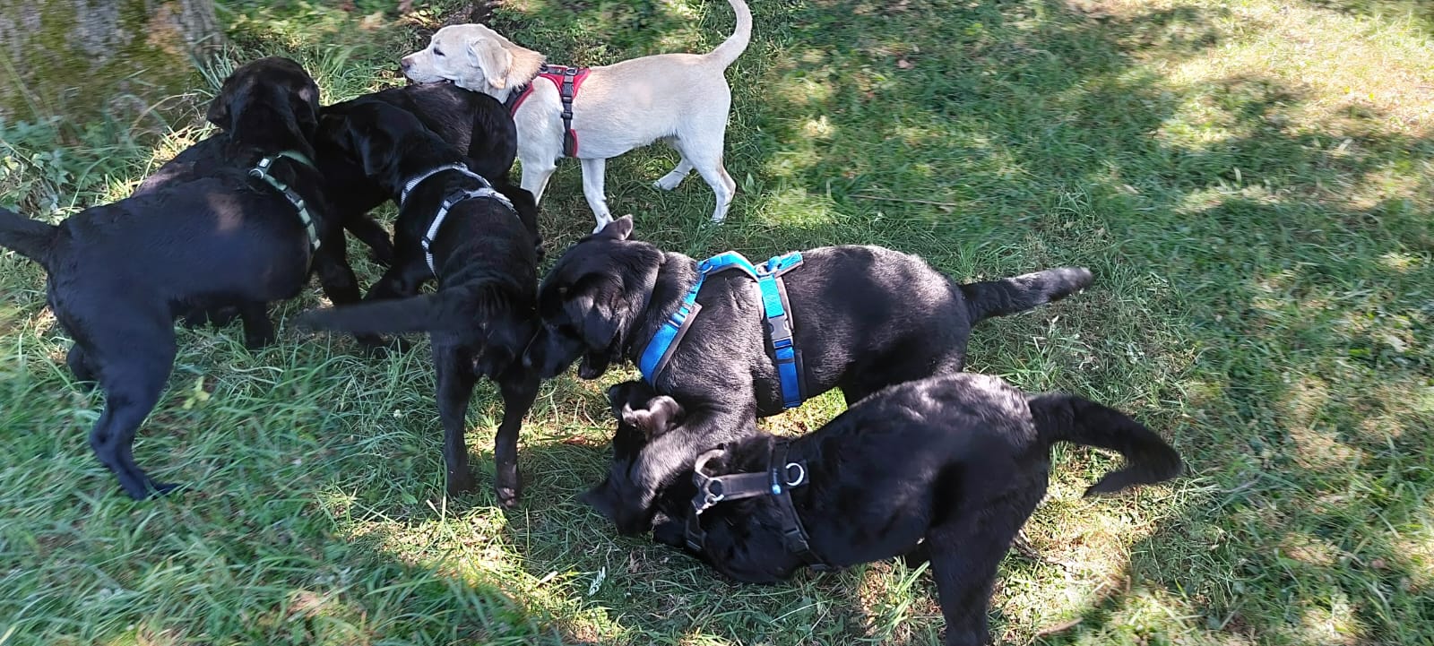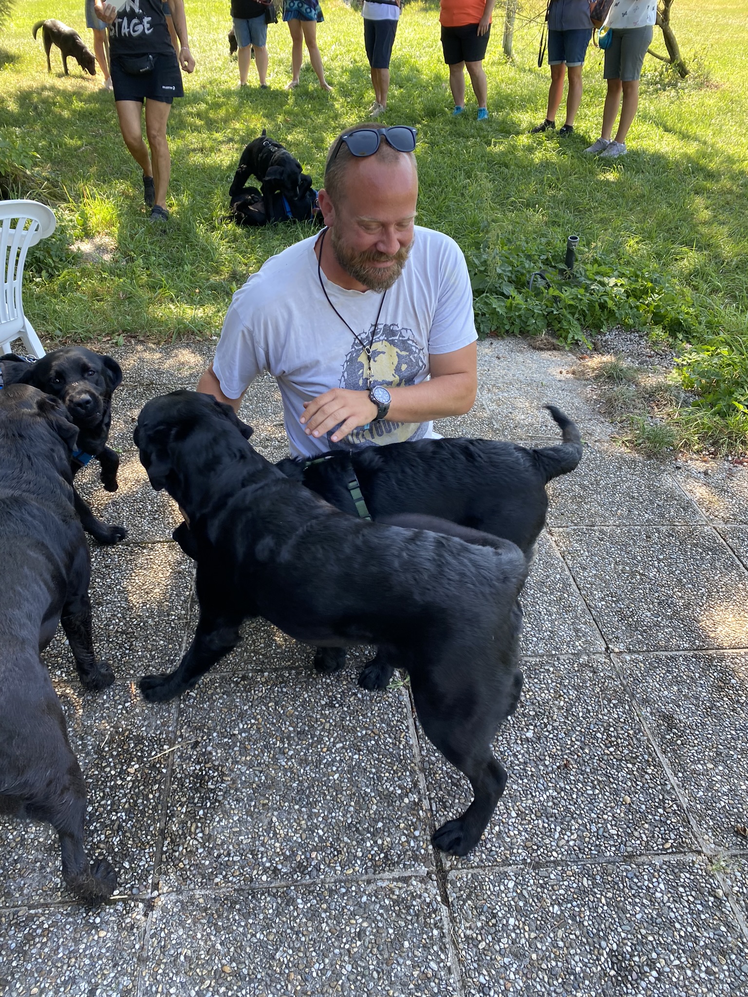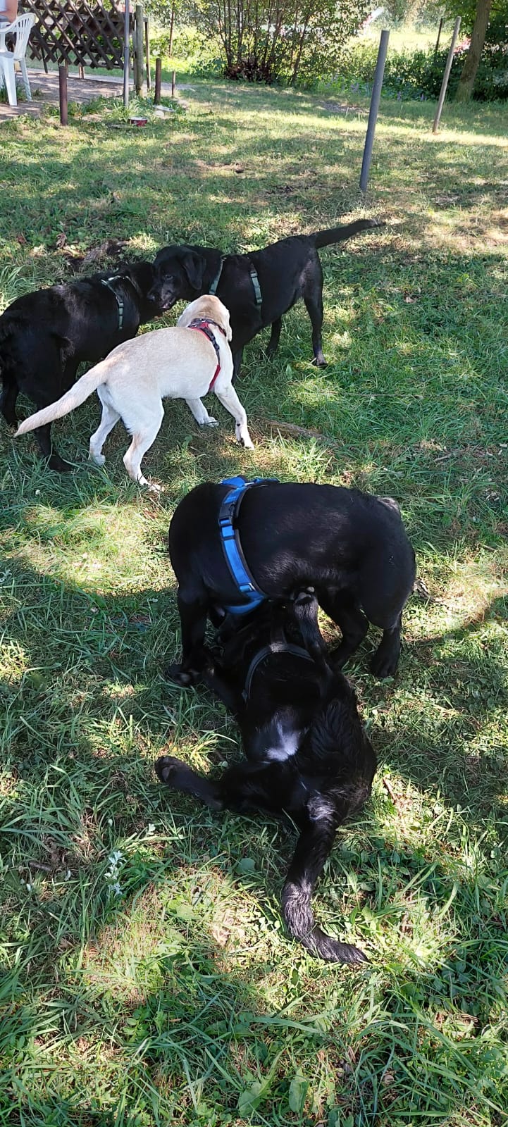 Bei strahlendem Sonnenschein und über 30 Grad, trafen letztendlich 21 Labrador Retriever, 2 altdeutsche Hütehunde (die Mitbewohnerinnen von Berti aus unserem B-Wurf), 31 Erwachsene und 7 Kinder aufeinander. Und weder bei Mensch noch Hund gab es irgendwelche gröberen Streitigkeiten. Alle Hunde haben sich zu supersozialen und fröhlichen Retrievern entwickelt – Hauptziel aller Vierbeiner war Spiel & Spaß. Und wenn es einem Hund doch zu viel wurde, wurde dies sofort von den anderen berücksichtigt und akzeptiert. Wirklich toll. Ich war diesbezüglich auch vom F-Wurf schwer beeindruckt…immerhin sind die Zwerge erst 5 Monate alt.