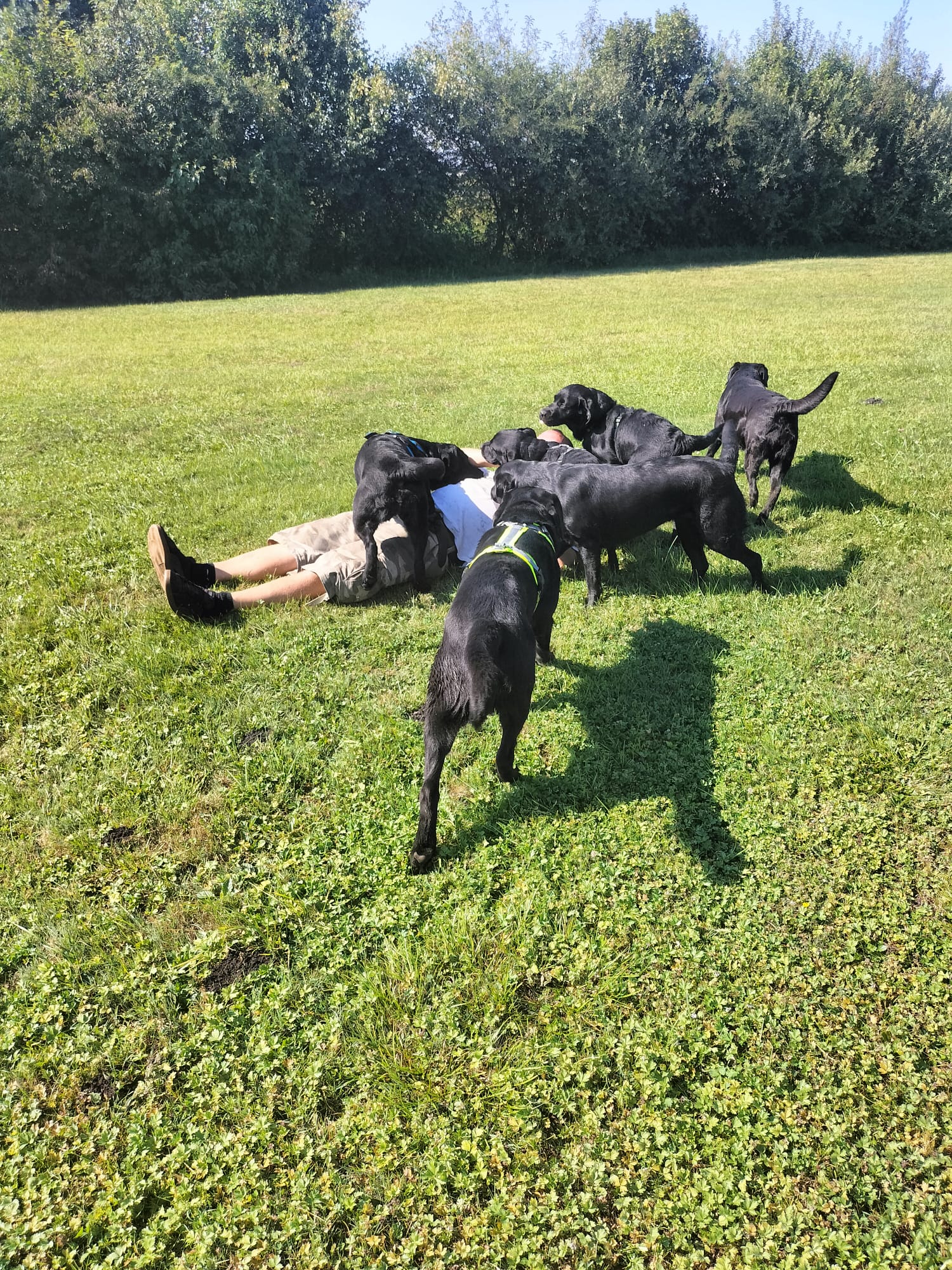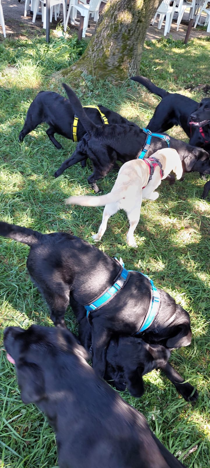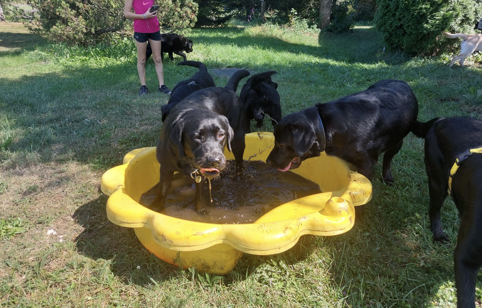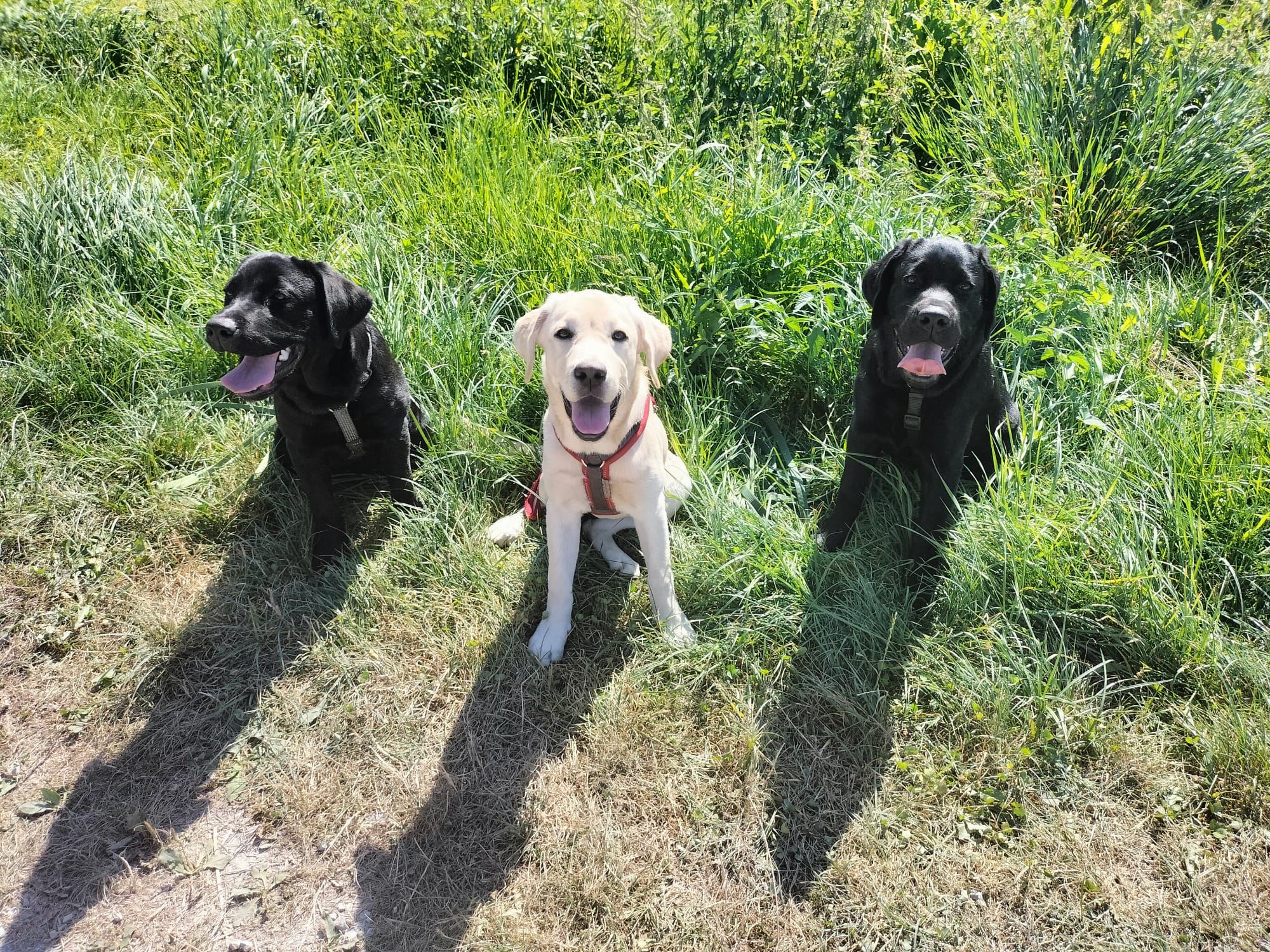 Bei strahlendem Sonnenschein und über 30 Grad, trafen letztendlich 21 Labrador Retriever, 2 altdeutsche Hütehunde (die Mitbewohnerinnen von Berti aus unserem B-Wurf), 31 Erwachsene und 7 Kinder aufeinander. Und weder bei Mensch noch Hund gab es irgendwelche gröberen Streitigkeiten. Alle Hunde haben sich zu supersozialen und fröhlichen Retrievern entwickelt – Hauptziel aller Vierbeiner war Spiel & Spaß. Und wenn es einem Hund doch zu viel wurde, wurde dies sofort von den anderen berücksichtigt und akzeptiert. Wirklich toll. Ich war diesbezüglich auch vom F-Wurf schwer beeindruckt…immerhin sind die Zwerge erst 5 Monate alt.