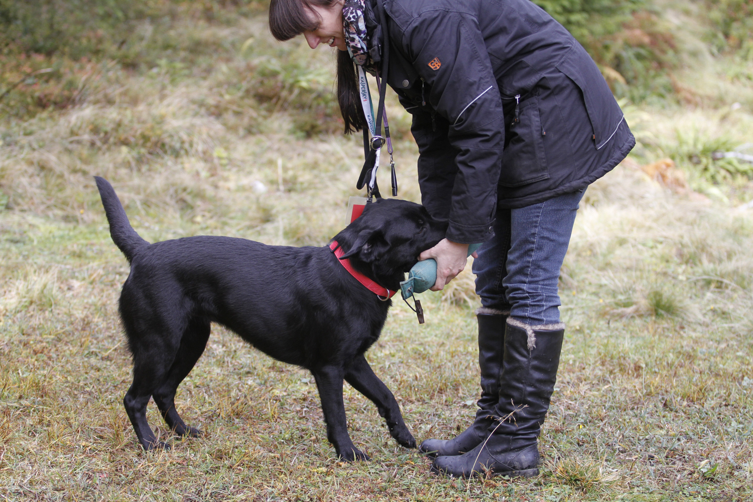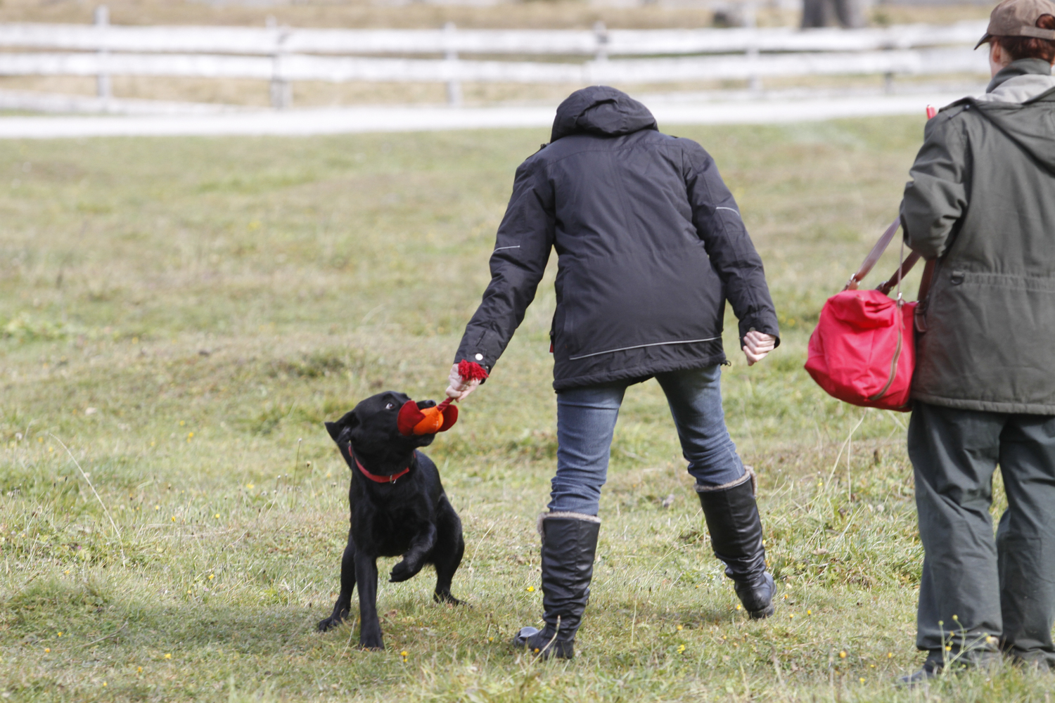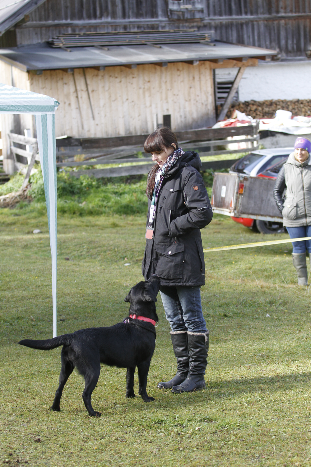 Wir sind zum Wesenstest des österreichischen Retrieverclubs in Seefeld/Tirol angetreten. Diesen benötigen wir, um die Zuchtzulassung für Fiby zu erhalten. Bei diesem Test werden Wesen und Anlagen des Retrievers beurteilt. Der Retriever soll ein idealer Familienhund sein, der allen erdenklichen Alltagssituationen gewachsen ist. Die Freundlichkeit und Sicherheit im Umgang mit Menschen, aber auch die Apportierfreude (die ja ebenfalls ein Rassemerkmal ist) werden hier auf den Prüfstand gestellt. Da sich nicht nur optische sondern auch charakterliche Anlagen vererben können, sollte ein Wesenstest für jeden Retriever-Züchter selbstverständlich sein.In Prüfungssituationen bin ich eigentlich nie entspannt – das ist auch ein Mitgrund, warum ich mit meinen Hunden so gut wie nie bei Prüfungen antrete. Dementsprechend aufgeregt startete ich am frühen Samstagmorgen meine Reise nach Seefeld. Ich kenne meine Fiby-Maus und wusste, dass sie alle Übungen meistern wird – das tat meiner Nervosität jedoch keinen Abbruch. Der Test startete im Formwertring wo die optischen Eigenschaften der Hunde beurteilt werden und wir schlossen diesen Teil mit folgender Richterbewertung ab: “3 Jahre alte schwarze Hündin, korrekter Typ, femininer Kopf mit liebem Ausdruck, gute Größe, korrekte Knochenstärke, Brustkorb sollte eine Spur tiefer und breiter sein, vorne steil hinten ausreichend gewinkelt, Bewegung in Ordnung – SEHR GUT”.