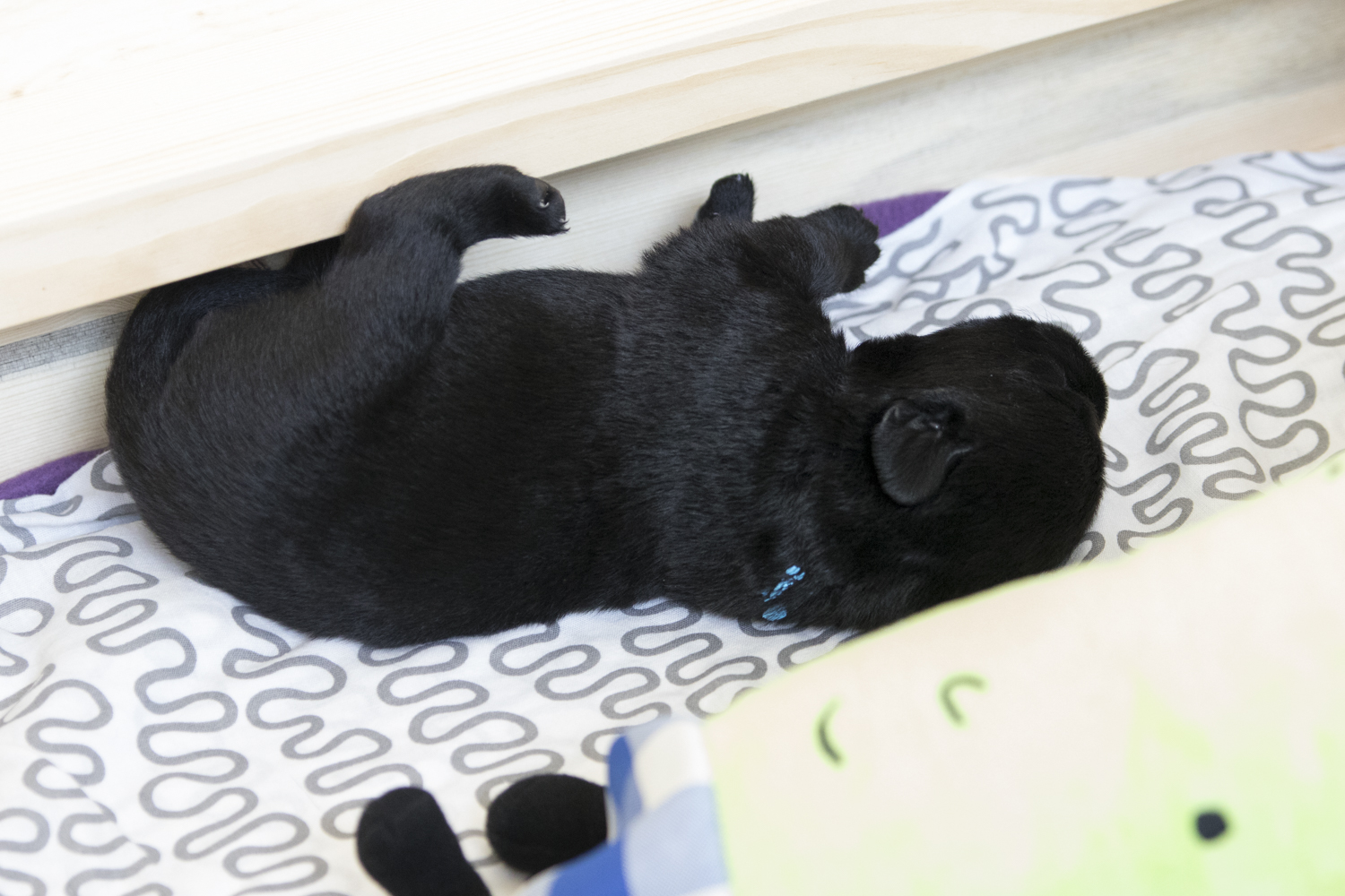 Für mich als Züchterin gibt es in den ersten Lebenswochen eine besonders wichtige und schöne Aufgabe, welcher ich täglich nachkomme: täglicher Körperkontakt und Streicheleinheiten. Mit jeder Schmuseeinheit spüren die Babies meine Berührung und nehmen meinen Geruch war. Mein Ziel ist es, dass meine Welpen beim Menschen die gleiche Geborgenheit und Sicherheit spüren, wie beim Kontakt mit Mami und den Geschwistern. Das wirkt sich positiv auf die spätere Bindungsfähigkeit aus. Somit liege ich täglich mit einem der Welpen auf dem Sofa neben der Wurfkiste und wir genießen die Zweisamkeit mit Streicheleinheiten und Küsschen. Damit ich niemanden vergesse, führe ich eine kleine Stricherl-Liste. Mein Nachtlager befindet sich immer noch neben der Wurfkiste...nicht weil ich Sorge hätte, dass Fiby ohne mich nicht zurecht kommt - vielmehr hat der enge Kontakt und meine nächtliche Anwesenheit tatsächlich auch Auswirkungen auf die spätere Bindungsfähigkeit. So ist in den ersten Lebenswochen nicht nur der Geruch von Mami und den Geschwistern präsent - es mischt sich auch noch Menschengeruch dazu. Und das ist gut...die Welt der Babies besteht somit nicht nur aus felligen Wurfkistenmitbewohnern.