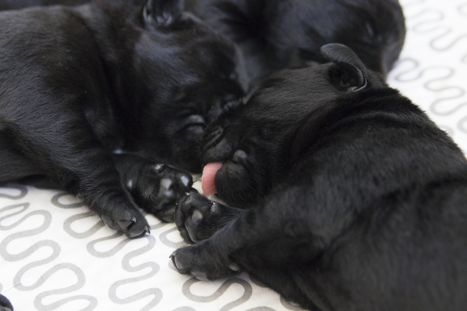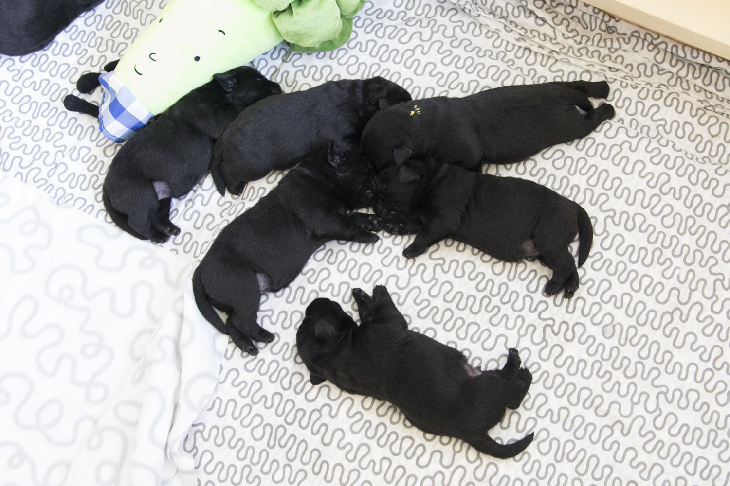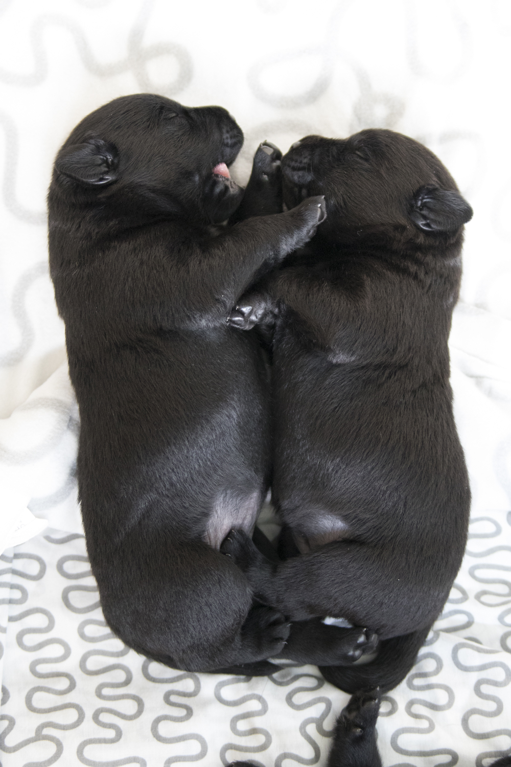 Viel Neues gibt es im Moment nicht zu berichten...die Welt der Zwerge besteht immer noch aus schlafen und trinken. Wobei sie mittlerweile im Schlaf bereits erste Bell- und Knurrversuche starten. Und heute morgen stand Arthur erstmals auf 4 Beinen...für eine Millisekunde. Ich freue mich auf die nächsten Tage...sobald die Babies ihre Augen geöffnet haben, wird es neue Bilder geben...heute mal ein paar aktuelle Bilder aus der Wurfkiste: