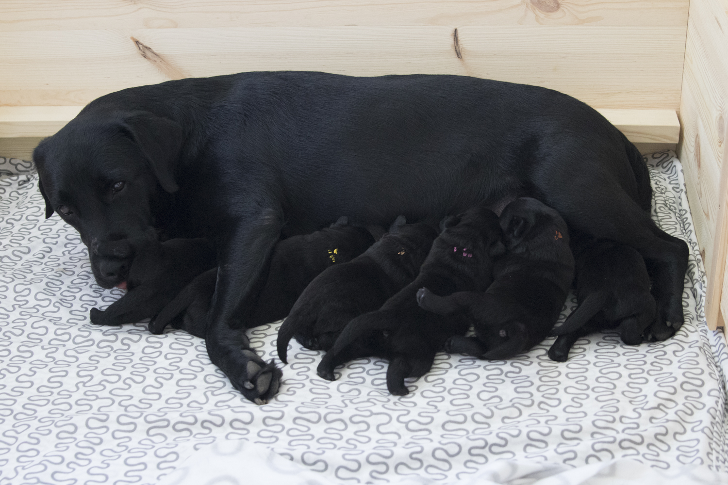 Und dann kam dieser eine Moment...ein Welpe den ich hochhob schrie genervt...Fiby kam herbei, leckte ihn ab, stieg in die Wurfkiste und von einer Sekunde auf die andere wurde sie zur Übermami. Sie putzte die Welpen von oben bis unten, beobachtete sie neugierig, reckte ihnen ihr Bäuchlein mit den riesigen Zitzen entgegen...und ich konnte sie erst viele Stunden später dazu bewegen, zumindest mal in den Garten zu gehen um zu pinkeln. Nichtmal für Futter kam sie aus der Wurfkiste...somit durfte sie dort ihre Mahlzeiten verspeisen. Mittlerweile haben wir das ganz gut im Griff...mehrmal am Tag gibts Futter...im Garten...somit erledigt sie sofort nach dem Fressen in Rekordgeschwindigkeit ihr Geschäft und rennt im Eilmodus zurück zu ihren Babies.