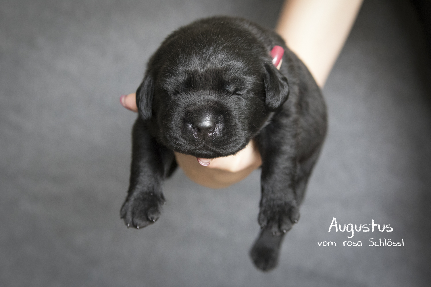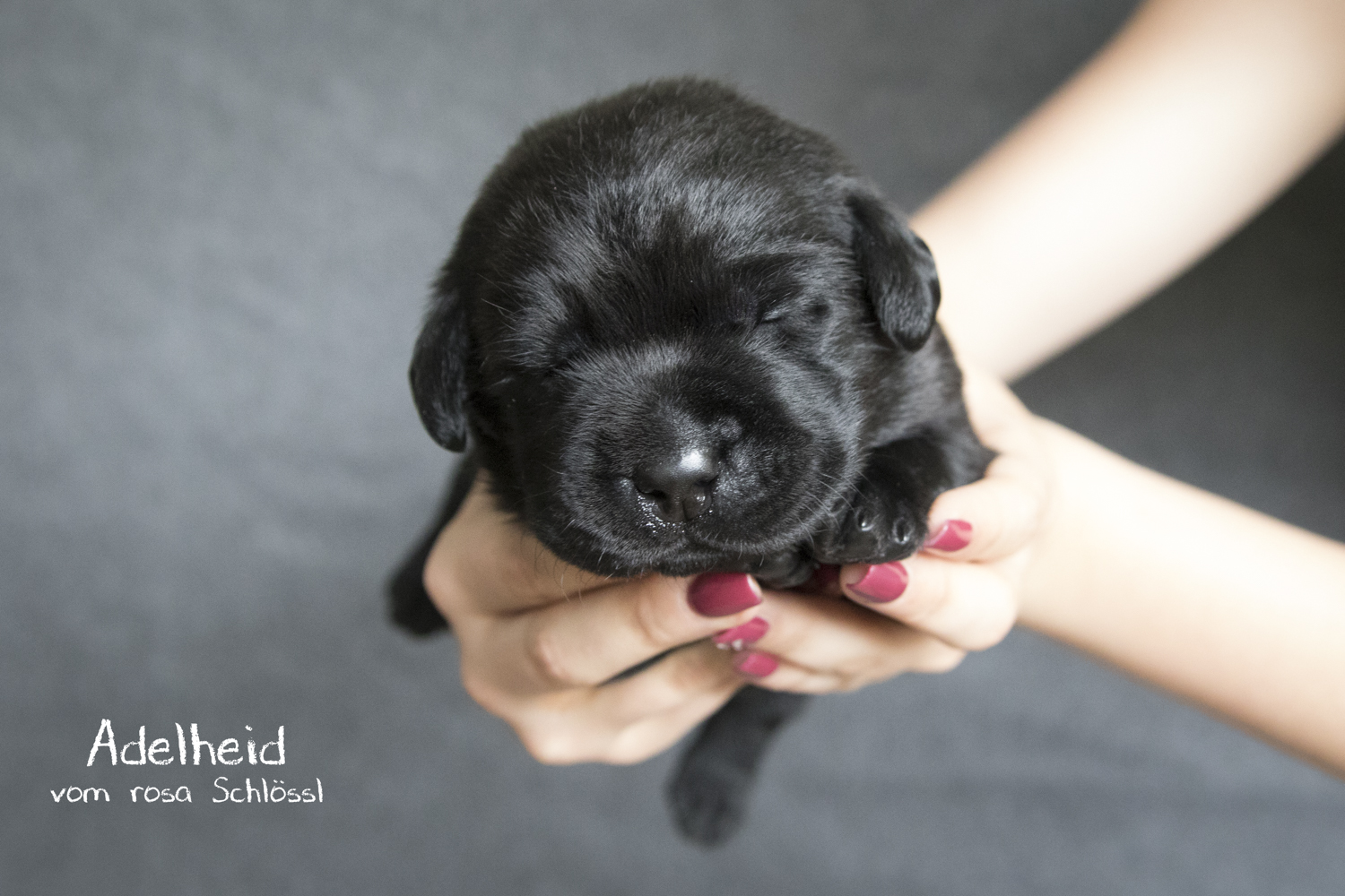 19 Stunden lang haben wir Fiby in den Eröffnungswehen beigestanden...haben sie gestreichelt, massiert und mit nassen Tüchern gekühlt. Als einige Zeit nach dem ersten Flüssigkeitsabgang noch immer keine Presswehen bei Fiby einsetzten und es ihr sichtlich schlechter ging, verfrachteten wir mein Mäuschen um ca. 19:15 Uhr ins Auto und düsten zu unserer Tierärztin (die Praxis ist zum Glück nur 2 Minuten von mir entfernt). Meine einzige Sorge galt in diesem Moment Fiby...alles andere war zweitrangig. Der OP war vorbereitet, ein Raum mit Sauerstoffzelt und Wärmeplatten für mögliche überlebende Welpen stand ebenfalls bereit. Fiby wurde narkotisiert und in den OP gebracht...Andi und ich standen mit Handtüchern vor der OP-Türe um die Welpen entgegenzunehmen und erstzuversorgen. Nach kurzer Zeit ging die OP-Türe auf und mir wurde der erste rosa-Schlössl-Welpe in die Hände gelegt. Unfassbar wie klein diese Zwerge sind...unfassbar wie überwältigt ich in diesem Moment war. Der Welpe atmete...die Tränen liefen mir übers Gesicht während ich den kleinen Zwerg trockenrubbelte, ihm vorsichtig das Fruchtwasser aus Mund und Näschen wischte und ihm gefühlte 100x sagte wie schön er ist. Andi war währendessen bereits mit dem zweiten Welpen beschäftigt und schon wurde uns der 3. Welpe (Adelheid vom rosa Schlössl - Heidi) gebracht - ein wirklich dickes Mäuschen und der Grund für die Geburts-Komplikationen. Sie atmete kaum und war sehr schwach...wir kämpften knapp 40 Minuten bis sie ihren ersten Schrei von sich gab. "Hallo Mäuschen...willkommen im Leben". Aber neben Heidi und den ersten beiden Welpen hatten wir noch 4 weitere Babies zu versorgen. Die Welpen wurden uns im Minutentakt gebracht. Dann endlich die erlösende Nachricht "Fiby geht es gut...wir nähen sie jetzt zu".