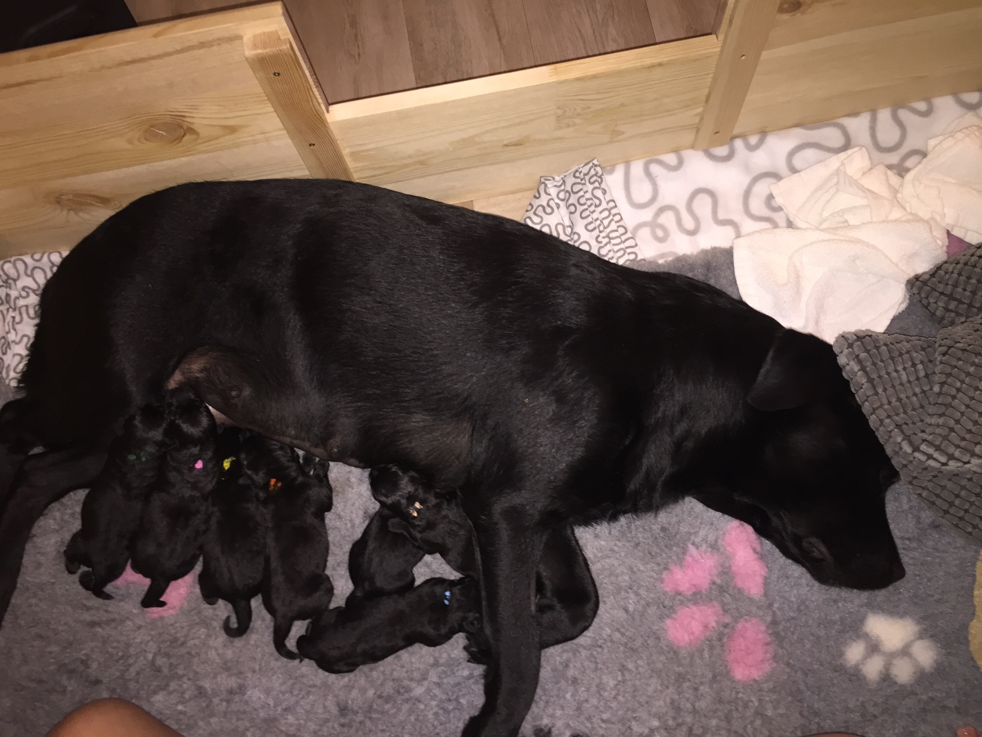 Mein Tag besteht hauptsächlich aus putzen, Wäsche waschen, wieder putzen, wieder Wäsche waschen...und natürlich Fiby mit ihren Babies beobachten. Anfangs lief ich noch bei jedem Welpen-Schrei zur Wurfkiste um zu kucken ob alles in Ordnung ist...mittlerweile weiß ich, dass alles bestens ist. Fiby ist eine noch tollere Hundemami als ich erwartet hatte. In der Nacht nach dem Kaiserschnitt und auch in den ersten Stunden am nächsten Tag, sah das noch ganz anders aus. Durch die Narkose war sie ziemlich mitgenommen und auch am nächsten Tag noch recht wackelig auf den Beinen. Vor den Welpen hatte sie Angst und ich konnte sie nur mit viel gutem Zureden überreden die Wurfkiste zu betreten. Und sobald sie wieder draußen war, flüchtete sie in einen anderen Raum und das Überredungsspiel ging von vorne los.