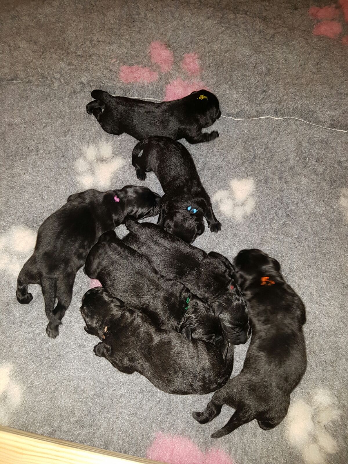 Ab dem Moment wo Fiby zum Aufwachen zu uns in den Welpenraum gebracht wurde, kümmerte ich mich ausschließlich um sie. Danke Andi, dass du dich in dieser Zeit so hervorragend um die Babies gekümmert hast. Um ca. 22 Uhr verließen wir mit 7 putzmunteren Zwergen und einer äußerst narkoserauschigen Fiby die Praxis und machten uns auf den Nachhauseweg. Danke an dieser Stelle an Frau Mag. Heidi Hirscher -Tierarztpraxis Lamprechtshausen für die liebevolle und rasche Hilfe. Daheim hatten wir dann endlich mal Zeit um die Welpen genauer zu untersuchen, sie zu wiegen und die Geschlechter rauszufinden. Durch den Kaiserschnitt hatte Fiby noch keine Milch - und wir versorgten die Babies mit Aufzuchtmilch aus Fläschchen. Ich hätte übrigens irrsinnig gerne ein Bild von Yoko's entsetztem Gesichtsausdruck, als wir mit einem Wäschekorb voll kreischender Welpen das Wohnzimmer betraten. Sie hat sofort die Flucht ergriffen und dachte vermutlich "wehe wenn das ein Geschenk für mich ist".